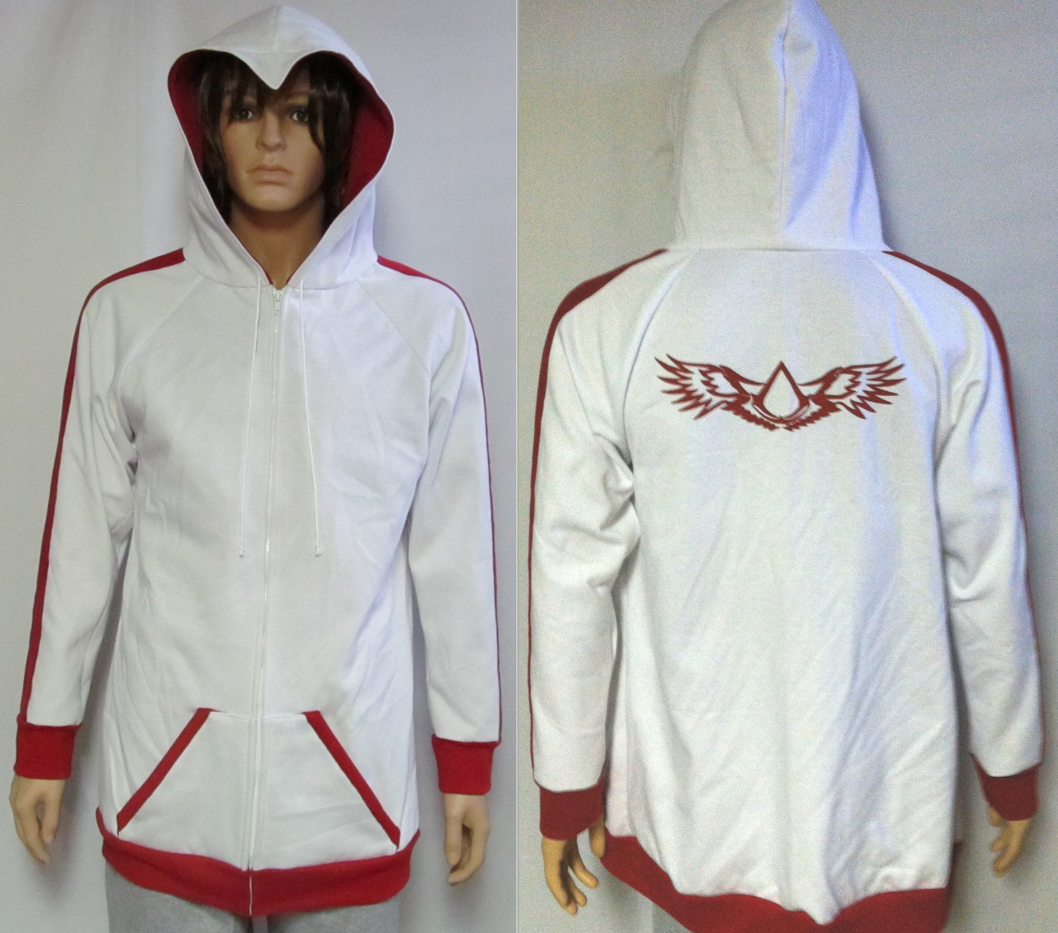 A jacket inspired by Assassin's Creed. The jacket was made from white sweatshirt fleece and fully lined with red knit. The red symbol on the back was permanently screen printed on. The front pockets were trimmed with red.