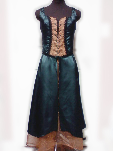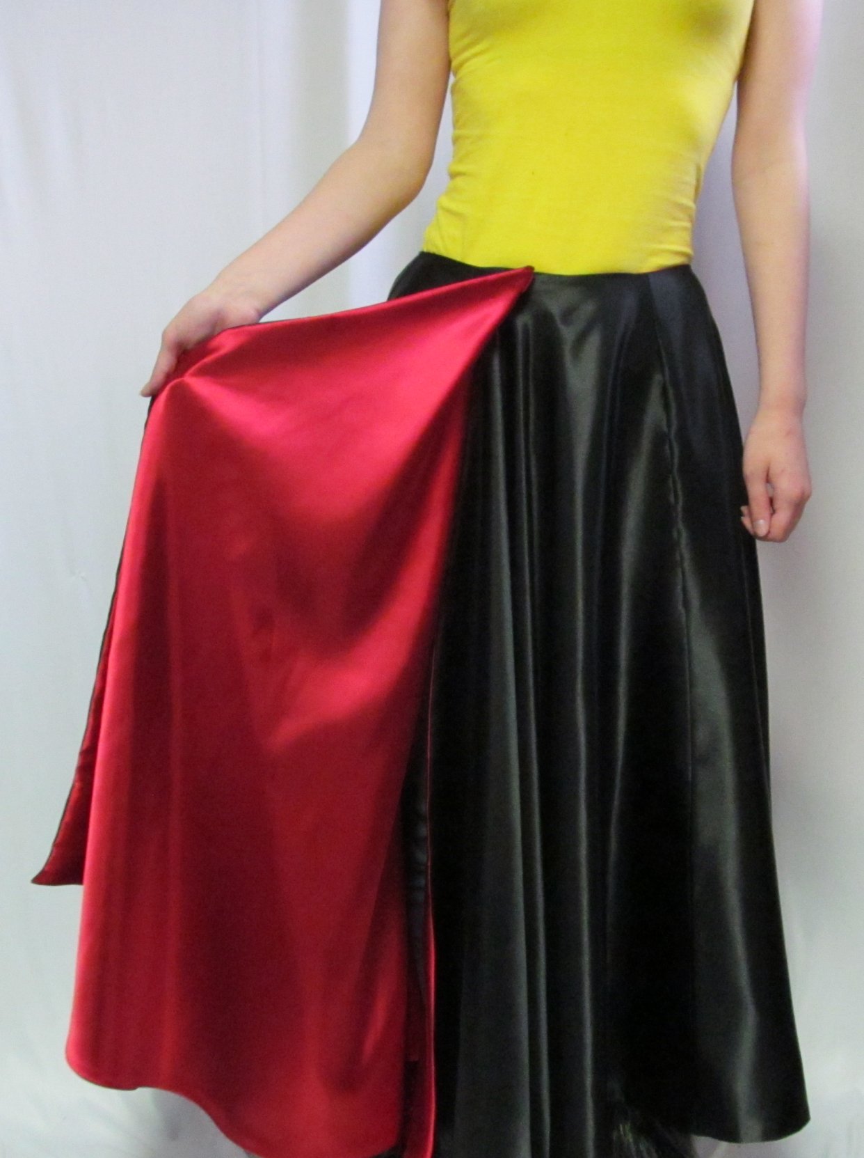 This was commissioned by a latin dancer who needed a fully line full circle skirt his partner could wear, then they could easily remove and he could use as a cape for his solo part of the dance. Made with baroque satin, the outer edge of the skirt/cape was almost 7 yards. It fastened with 1" tabs of velcro so it could be easily removed during the dance.
