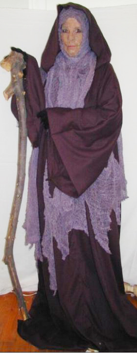 This was made with cotton and hand-dyed and shredded cheesecloth. We did the makeup effects with foundation and oatmeal.