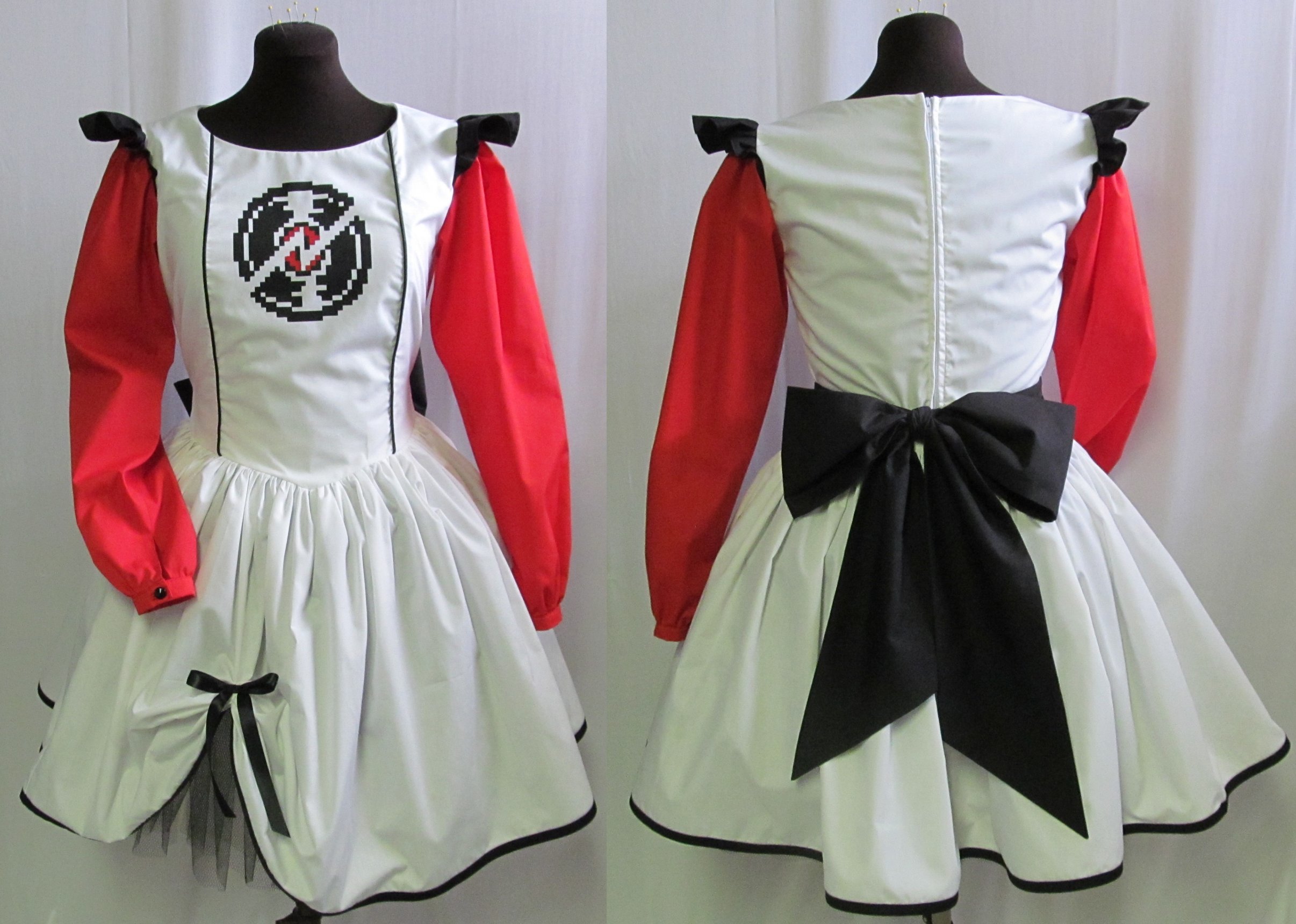 Inspired by the character Dave Strider from a webcomic. Done in a "lolita" style, with a full skirt with netting underskirt, red sleeves and big black bow in back. The record symbol in the front was permanently screen printed on.