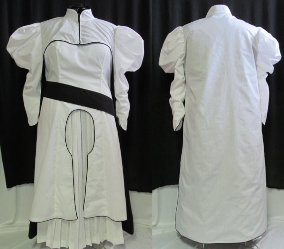Orihime Inoue from Bleach, custom fit to the person's measurements. The sleeves are French sleeves, with piping at the wrist and fully lined so they hold their "poof" without needing a separate seam between the lower sleeve and upper sleeve. The jacket is fully lined and the keyhole opening trimmed with black piping.