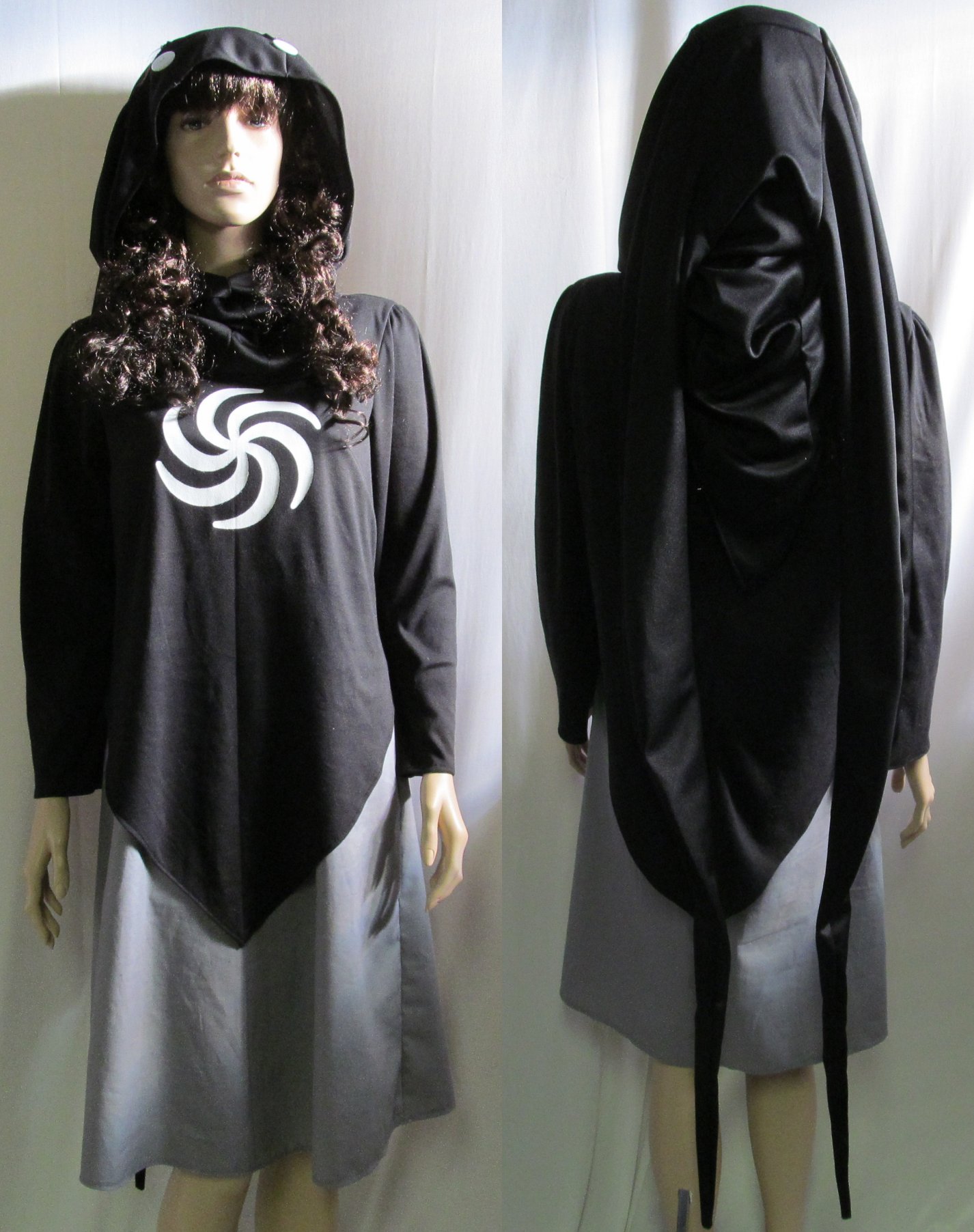 Inspired by the Witch of Space character from a webcomic. It included the grey dress, black over dress with the swirl symbol permanently screen printed onto it and the hood with two long tendrils down the back.